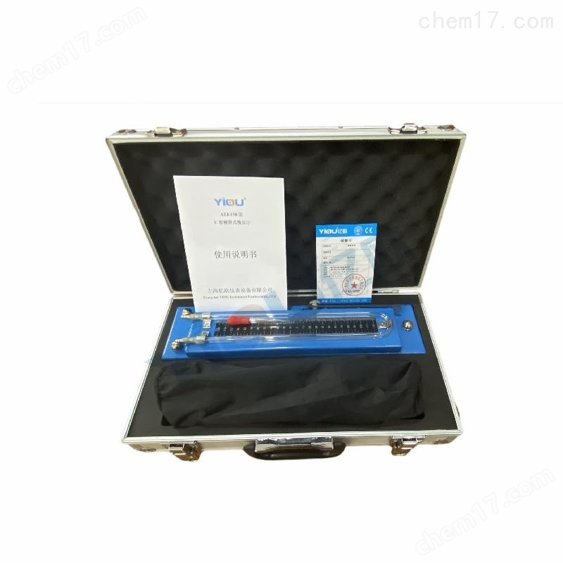 U型压差计由底板、平板、托板以及配用的三脚架等部分组成。底板下面安装有与三脚架连接的连接螺母。平板上面装有条形水准器及水平微调螺钉。托板上面安装有U形玻璃测量管、标度尺,其侧面安装有可调节倾斜系数的支架 锁紧装置,倾斜系数分别为0.1,0.2,0.5,0.7.配备的三脚架其支脚高度伸缩可调,并具有水平调节和锁紧功能。