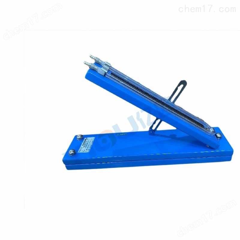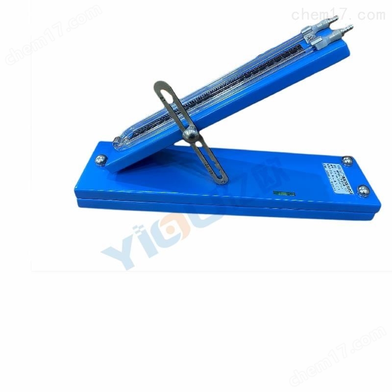 U型压差计由底板、平板、托板以及配用的三脚架等部分组成。底板下面安装有与三脚架连接的连接螺母。平板上面装有条形水准器及水平微调螺钉。托板上面安装有U形玻璃测量管、标度尺,其侧面安装有可调节倾斜系数的支架 锁紧装置,倾斜系数分别为0.1,0.2,0.5,0.7.配备的三脚架其支脚高度伸缩可调,并具有水平调节和锁紧功能。